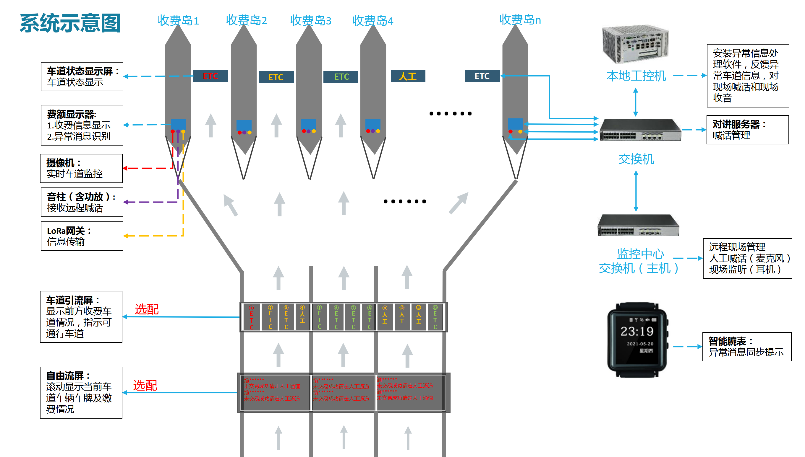 該系統(tǒng)由費(fèi)額顯示系統(tǒng)、語音提示系統(tǒng)、無線通信系統(tǒng)、車道狀態(tài)屏、車道引流屏共同組成。系統(tǒng)還配置了專門的軟件管理平臺(tái),可對(duì)每一條收費(fèi)車道進(jìn)行實(shí)時(shí)監(jiān)控,管理人員無需到場(chǎng)即可通過“遠(yuǎn)程喊話”的形式處理特情。系統(tǒng)還可集成自由流屏和車道引流屏,一同助力打造暢行的高速公路收費(fèi)站。